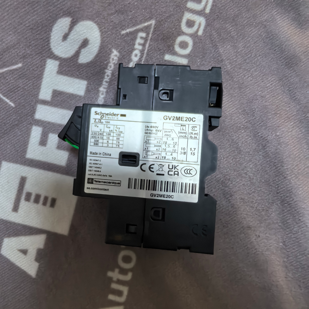 The Schneider Electric GV2ME20C is a 3‑pole thermal‑magnetic motor circuit breaker belonging to the TeSys GV2 series, designed for the control and comprehensive protection of three‑phase motors. It features an adjustable thermal current setting range of 13 A to 18 A and is rated for a maximum operational voltage of 690 V AC (50/60 Hz), making it suitable for motors up to 7.5 kW in standard 400 V AC industrial systems.