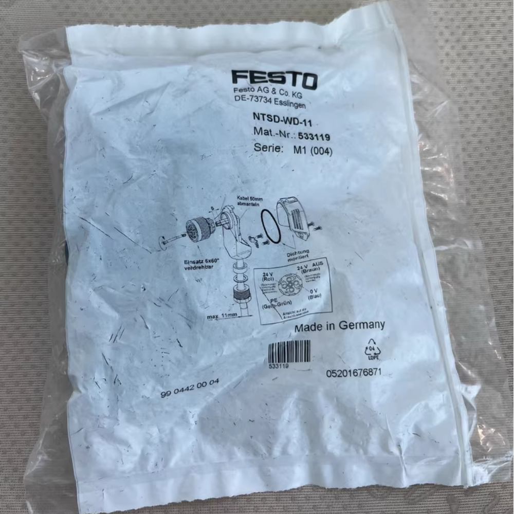 - The net weight of the Festo NTSD-WD-11 power supply socket (order code 533119) is approximately 0.03 kg (30 grams), making it extremely lightweight and easy to handle during installation, inventory management, and system configuration.
