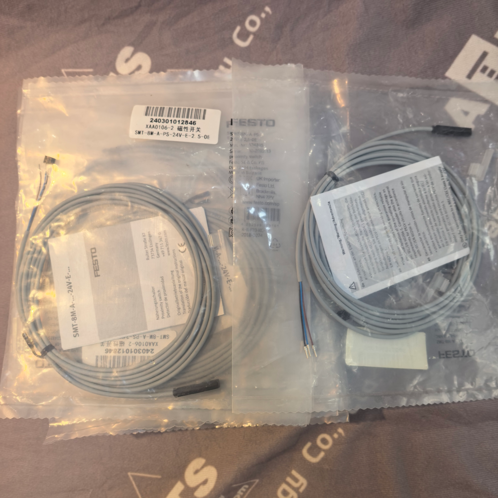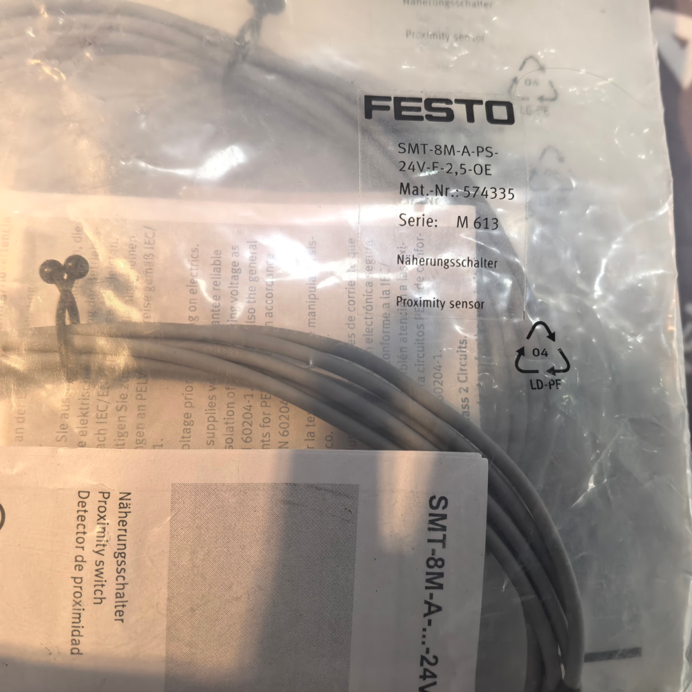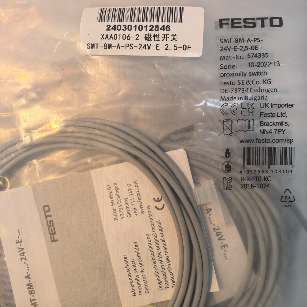 The Festo SMT-8M-A-PS-24V-E-2,5-OE (Order Code: 574335) is a compact inductive proximity sensor belonging to Festo’s SMT series, engineered for non-contact position detection in industrial automation systems. Optimized for direct mounting on Festo’s T-slot profile pneumatic cylinders, actuators and grippers, it features an M8 cylindrical housing, a 2.5 mm nominal sensing distance and PNP normally open output, delivering high-precision position feedback for automated motion control. With a 24V DC power supply (10–30V DC operating range), 2.5 m pre-wired M12 connector cable and IP67 protection, it operates reliably in harsh industrial environments with dust, moisture and coolants. RoHS and CE compliant, this sensor integrates overload, short-circuit and reverse polarity protection, making it a durable, plug-and-play solution for assembly lines, material handling, packaging machinery and other pneumatic automation applications.
