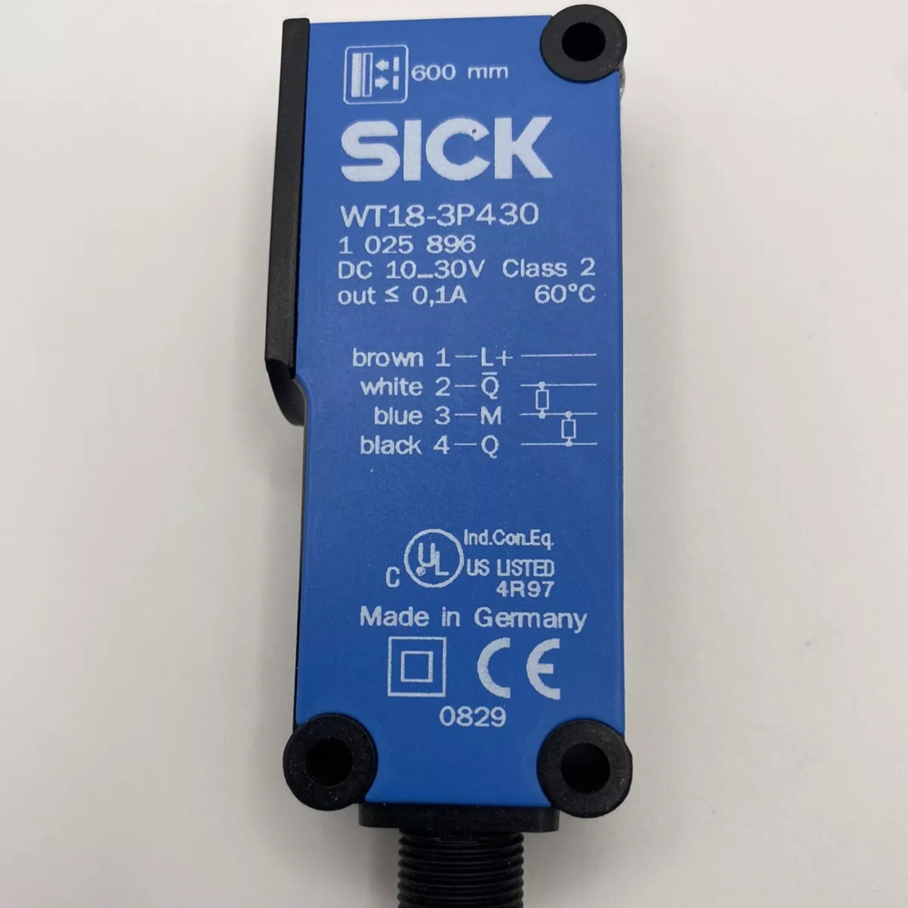 The SICK WT18-3P430 is a compact retro-reflective photoelectric sensor from SICK’s WT18 series, engineered for reliable non-contact object detection in industrial automation environments. It features a high-performance infrared LED light source, polarized optics, and a PNP normally open (NO) output, with a maximum switching distance of 5 m for standard retro-reflective tape (SICK PL80A). Designed for versatility, this sensor excels in packaging, material handling, conveyor systems, and assembly line applications, delivering consistent detection of both opaque and semi-transparent targets while resisting ambient light interference. Housed in a rugged, compact ABS/metal hybrid casing with an IP67 protection rating, it withstands dust, water immersion, and industrial vibration, ensuring stable operation in harsh factory conditions. The sensor operates on a 10–30V DC power supply, integrates a 4-pin M12 male connector for quick plug-and-play installation, and requires no complex calibration—making it a cost-effective, low-maintenance solution for high-speed and high-volume production processes. It is certified to international industrial standards, ensuring seamless integration into global automation systems.