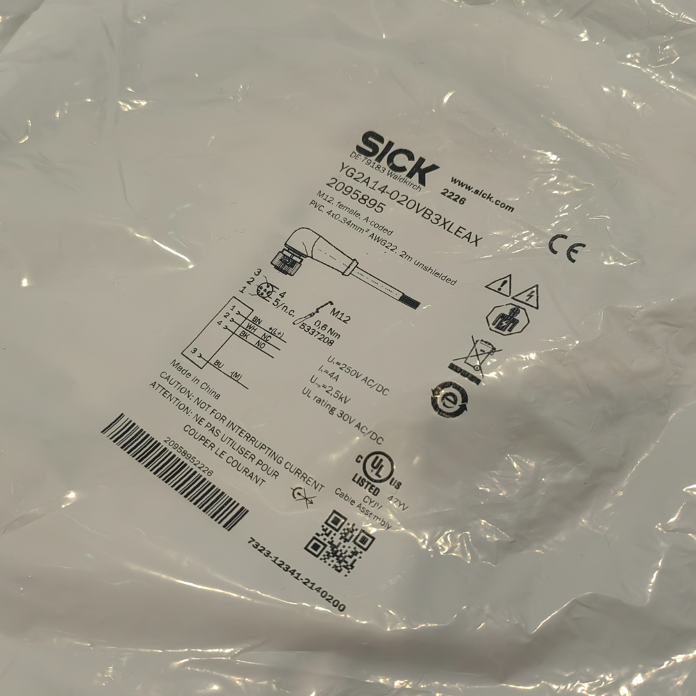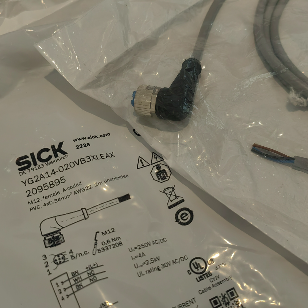 - Flexible Connection: The angled M12 4-pin A-coded female connector enables easy connection to sensors/actuators, while flying leads allow direct wiring to control panels or terminal blocks, supporting diverse installation scenariosSICK.