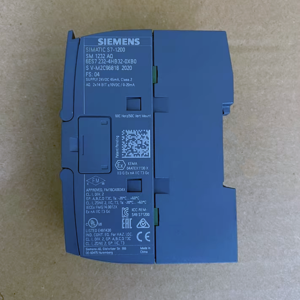 The Siemens 6ES7232-4HB32-0XB0 is an analog output module (SM 1232) designed for the SIMATIC S7‑1200 compact PLC series. It converts digital control signals from the CPU into stable, precise analog voltage or current signals to control field actuators such as control valves, frequency converters, analog indicators, positioners, and regulators. Featuring high accuracy, low drift, and strong anti-interference performance, this module is widely used in process automation, packaging machinery, temperature control systems, and small‑to‑medium automation equipment.
