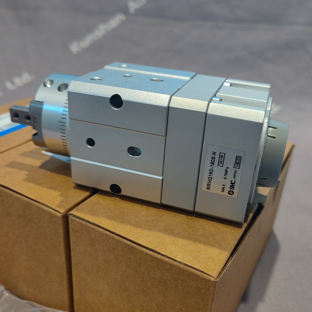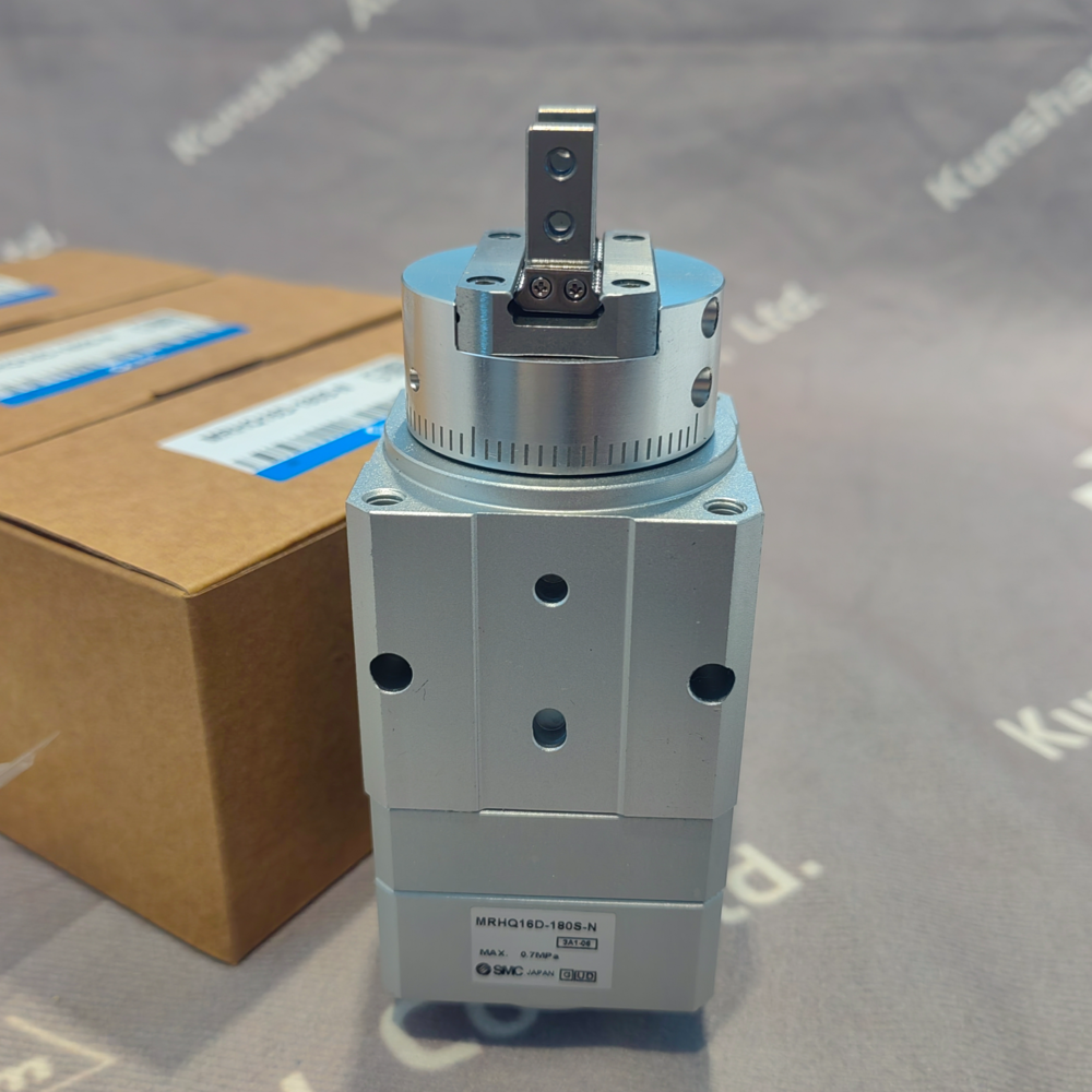 The SMC MRHQ16D-180S-N is a 2-finger parallel rotary gripper cylinder from SMC’s MRHQ series, integrating gripping and 180° rotary functions in a compact cylindrical body. It features a 16 mm bore, double-acting operation, and a single-vane rotary mechanism for precise 180° ±10° rotation (adjustable by ±5° at both ends). The parallel – finger design, driven by a wedge cam, ensures synchronous opening/closing with a 3 mm single – finger stroke, suitable for handling small – to – medium – sized cylindrical, square, or polygonal workpieces in transfer lines, assembly stations, and robotic pick – and – place tasks. Its integrated structure reduces piping/wiring tangling and is 20% shorter in longitudinal dimension than combined rotary table – air gripper setups. The built – in magnetic ring supports magnetic switches for position feedback, enabling seamless PLC integration, and it has ±0.01 mm finger repeatability for high – precision automation.