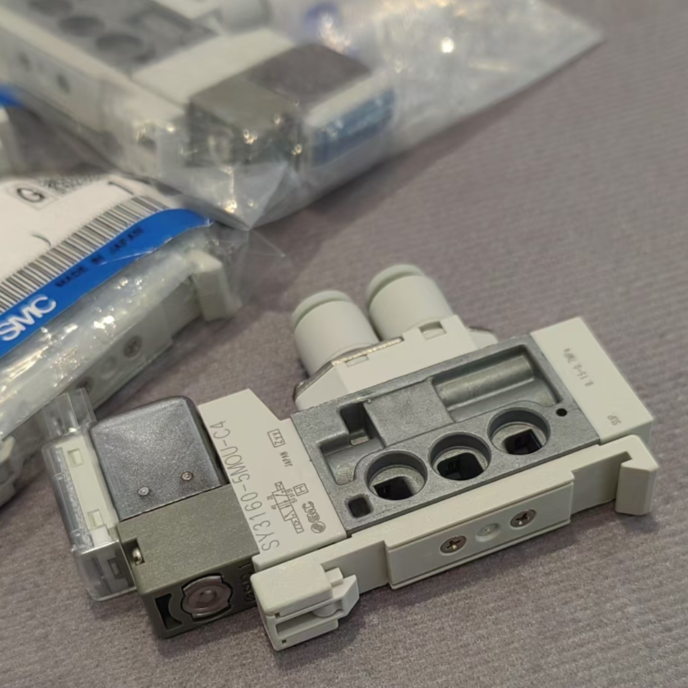 The SMC SY3160-5MOU-C4 is a compact 2-position, 5-port single solenoid valve from SMC’s SY3000 series, engineered for precise pneumatic control in industrial automation systems. It features an internal pilot operation design, a DC24V low-power solenoid coil, and C4 (Φ4 mm) quick-connect ports for streamlined tubing integration. With an operating pressure range of 0.15–0.7 MPa, this valve is optimized to control double-acting cylinders in applications such as electronic component assembly, small-part pick-and-place systems, and light-duty packaging machinery. The integrated non-locking push-type manual override enables on-site debugging without power supply, while its IP65 protection rating ensures reliable performance in dusty or humid industrial environments. Its space-saving die-cast zinc alloy body and flexible mounting options (sub-base or direct piping) make it ideal for dense automation setups requiring minimal installation space.