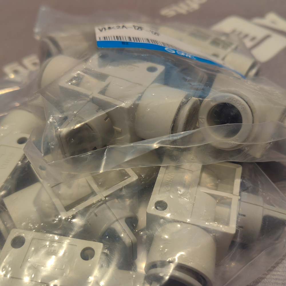 The SMC VHK2A-12F-12F is a 2-port, 2-position manual finger valve belonging to SMC’s VHK-A series, designed for manual on/off control of compressed air in industrial pneumatic systems. It features a poppet valve structure with 12mm one-touch fittings on both the supply (P) and actuator (A) ports, making it ideal for quick and easy manual control in applications such as machine tool clamping, fixture positioning, small – bore cylinder actuation, and manual override in automated production lines. With a maximum operating pressure of 1.0 MPa and a proof pressure of 1.5 MPa, this valve offers reliable performance, a small knob operation force, and a clear open/closed indication via the knob direction, facilitating intuitive on – site operation and maintenance. The compact PBT (Polybutylene Terephthalate) body and lightweight design enable flexible installation in space – constrained areas, and its compatibility with nylon, soft nylon, and polyurethane tubing ensures broad applicability in diverse industrial piping setups. It is also RoHS – compliant, meeting international environmental standards for eco – friendly production facilities.