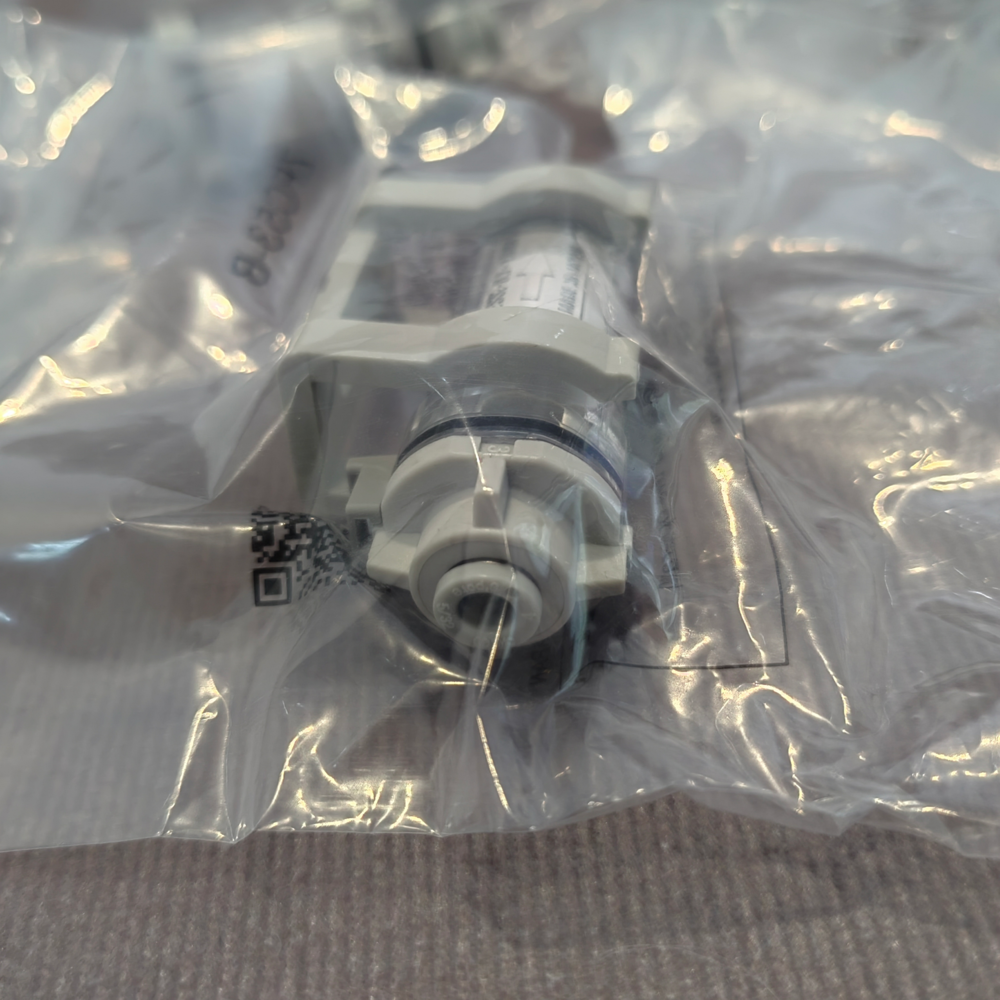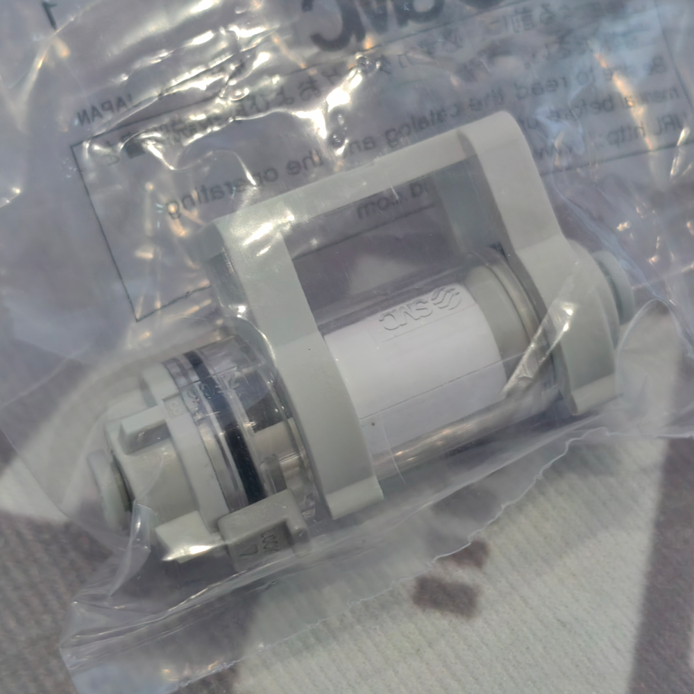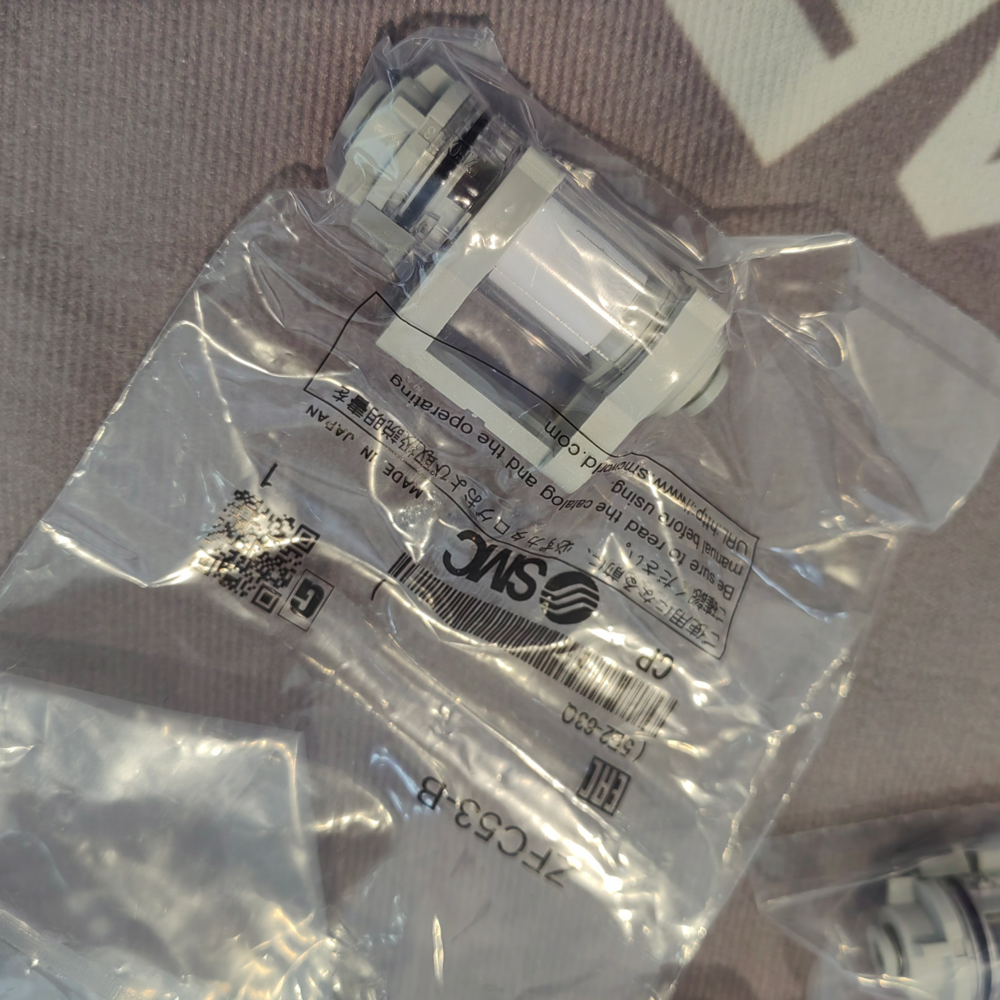 The SMC ZFC53-B is a compact in-line vacuum filter from the SMC ZFC series, designed for both positive and vacuum pressure applications in industrial pneumatic systems. It features 4mm one-touch fittings on both inlet and outlet ports, a 5μm filtration precision, and a transparent polycarbonate case with a built-in anti-rotation mechanism to prevent component scattering during positive pressure operation. This filter is ideal for protecting vacuum generators, suction cups, and other pneumatic components from dust, debris, and solid particles in applications such as material handling, pick-and-place systems, and automated assembly lines. With an operating pressure range of -100 kPa to 1.0 MPa and a proof pressure of 1.5 MPa, it ensures reliable filtration performance in diverse industrial environments. The lightweight design (10.5g with bracket) and tool-free element replacement make it easy to install and maintain in space-constrained setups, while its compatibility with air and nitrogen extends its usability across various pneumatic systems. It is also RoHS-compliant, meeting international environmental standards for eco-friendly production facilities.